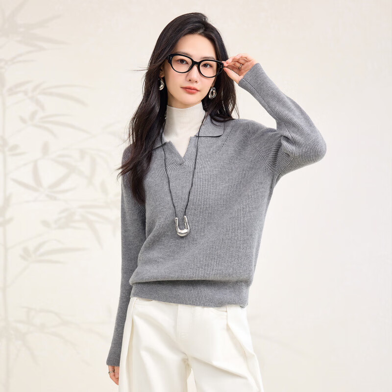 春竹【纯羊毛】25秋冬新款翻领洋气加厚保暖毛衣气质减龄休闲女羊毛衫 浅灰色 XL (110-125斤)