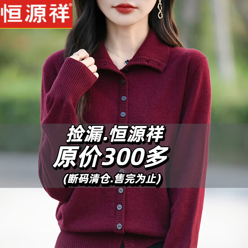 恒源祥2025新款翻领针织衫女士开衫毛衣外套冬季加厚高领羊毛打底衫宽松 安哥拉红 XL 120-140斤