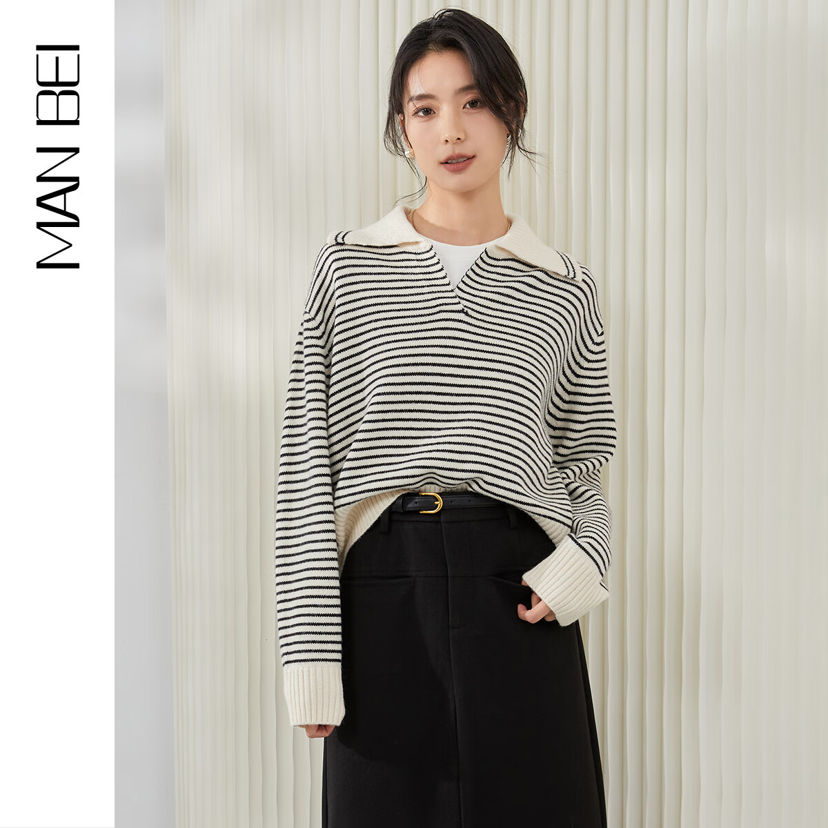 曼·贝(MANBEI)2025冬季新款条纹翻领毛衣开衫外套女通勤百搭软糯加厚针织衫 黑条纹 M