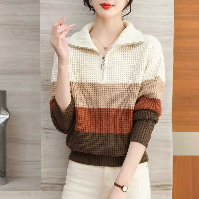 毛衣女秋冬高级感大码翻领毛衣女春秋季条纹加厚毛衣女冬季翻领外 驼色 M