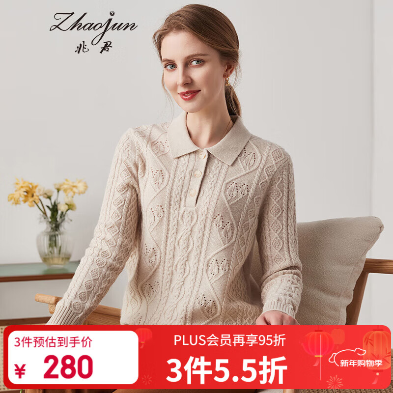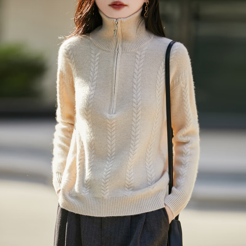 兆君2024秋冬时尚绞花翻领长袖羊毛衫女简约纯色加厚保暖毛衣 椰米色 M