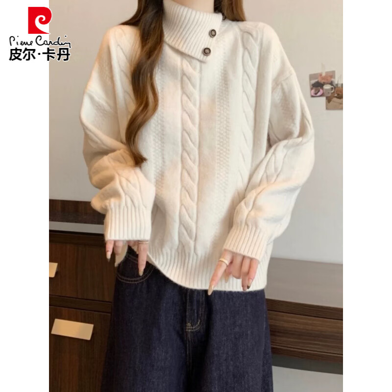 皮尔卡丹(pierre cardin)法式不规则高领套头麻花毛衣女秋冬加厚宽松慵懒风翻领针织衫上衣 米白色 S