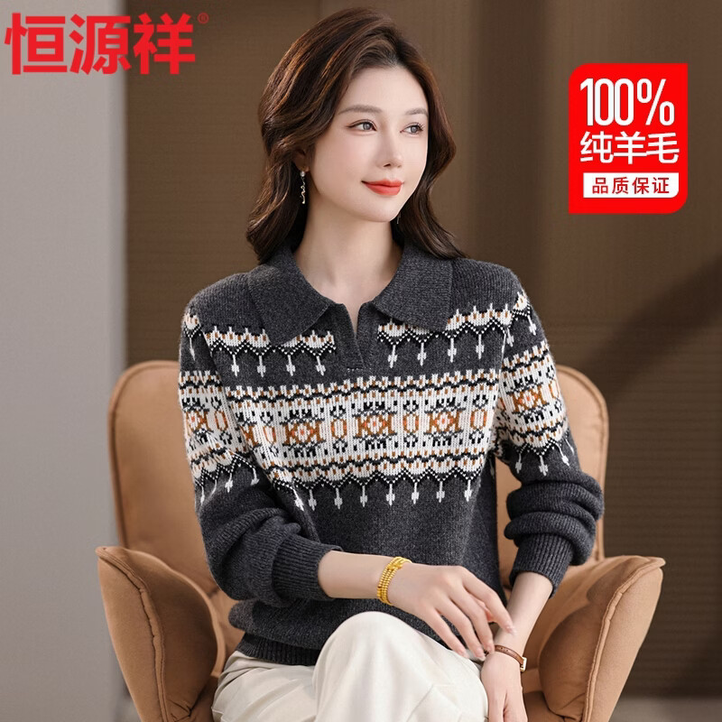 恒源祥羊毛衫女100纯羊毛妈妈冬装翻领加厚保暖中老年女装打底毛衣外穿