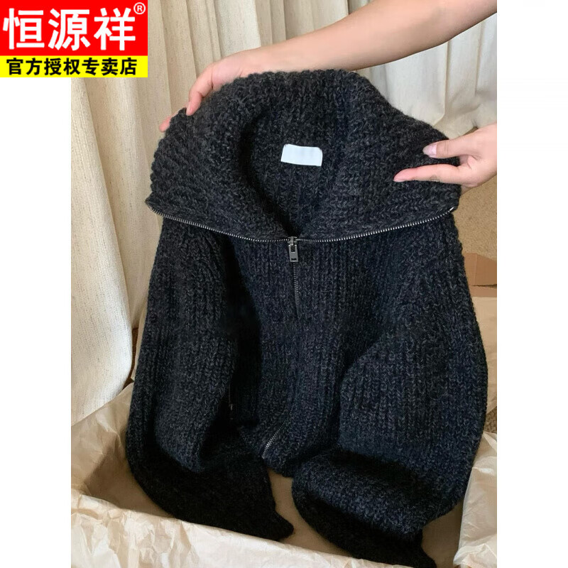 恒源祥秋冬新款黑色大翻领拉链毛衣外套女慵懒风加厚高领针织开衫上衣女 黑色毛衣 S 建议(80-95斤)