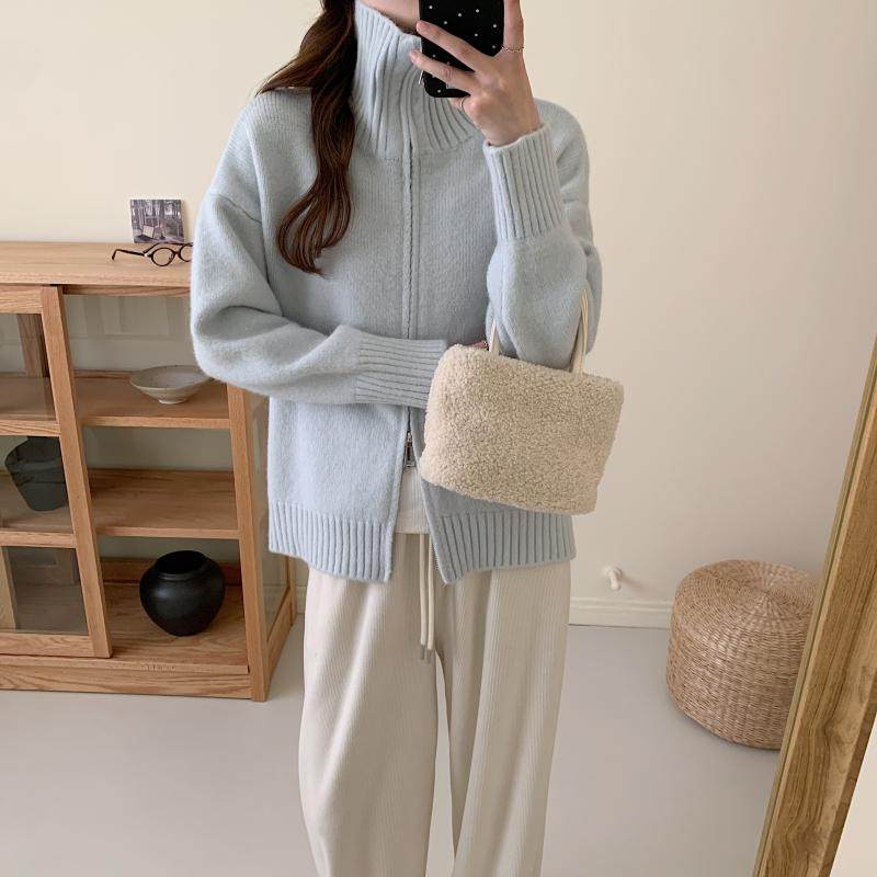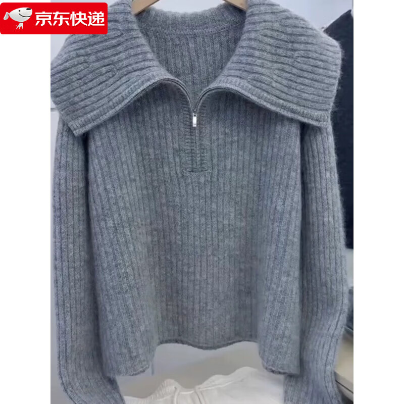 小红书蓝色翻领拉链毛衣外套女秋冬加厚宽松高领 浅蓝色 M 85-100斤