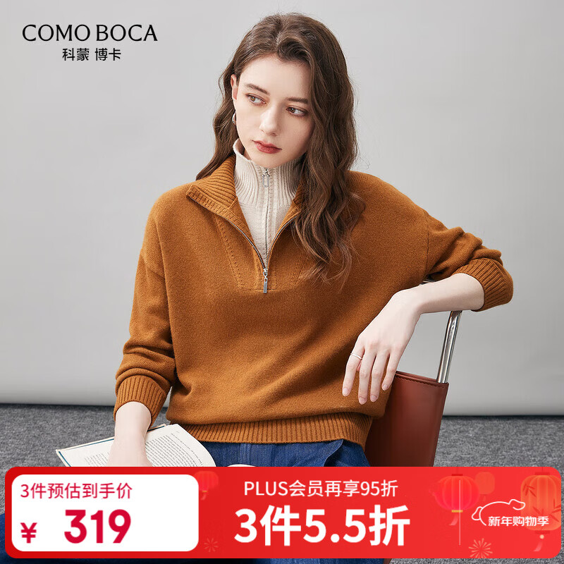 科蒙博卡2025秋冬新款翻领加厚羊毛衫女装假两件针织衫宽松撞色毛衣 焦糖色 M
