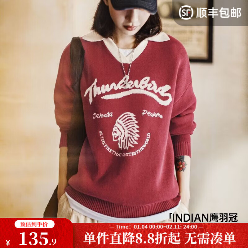 马登撞色V翻领宽松套头衫加厚新年红色毛衣女复古提花保暖内搭上衣冬 酒红色 【羽冠针织衫/女士毛衣/毛线衣/秋冬可外穿】 S (80-120斤)