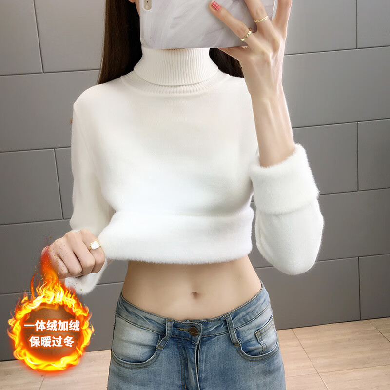盼舒高领毛衣加绒加厚冬款女绒秋冬翻领长袖针织打底衫外穿纯色上衣 白色 均码