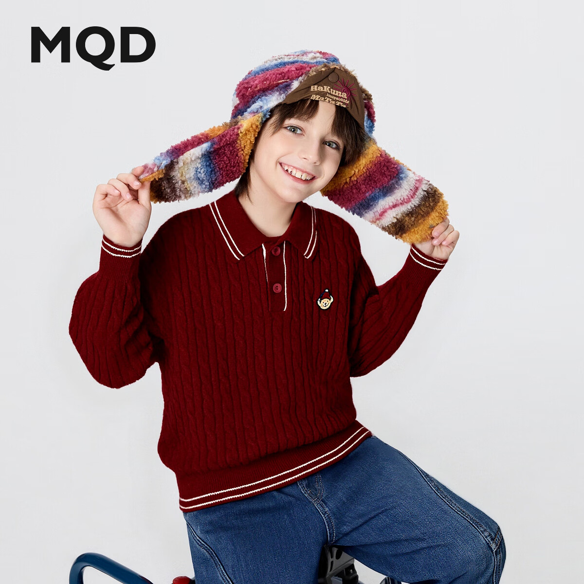 马骑顿MQD男童25冬新款经典学院风麻花肌理感保暖翻领毛衣针织衫 暗红 130