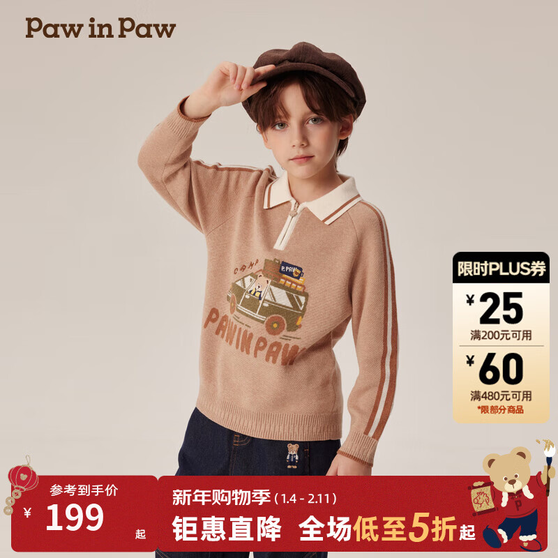 PawinPaw卡通小熊童装秋冬男童经典翻领毛衣舒适百搭 D/Beige深米色/37 150 cm