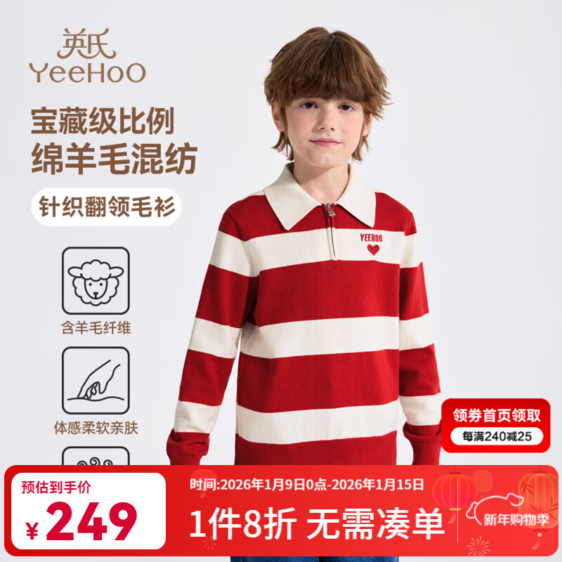 英氏(YEEHOO)儿童毛衣男童针织衫冬季保暖亲肤上衣含羊毛条纹翻领中大童装新品 阳光海岸-红白条 140