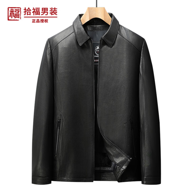 拾福羊皮皮衣男短款翻领皮夹克秋冬商务休闲外套中老年爸爸装上衣衣服 黑色 4XL (195)
