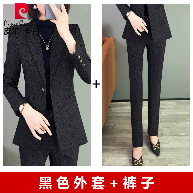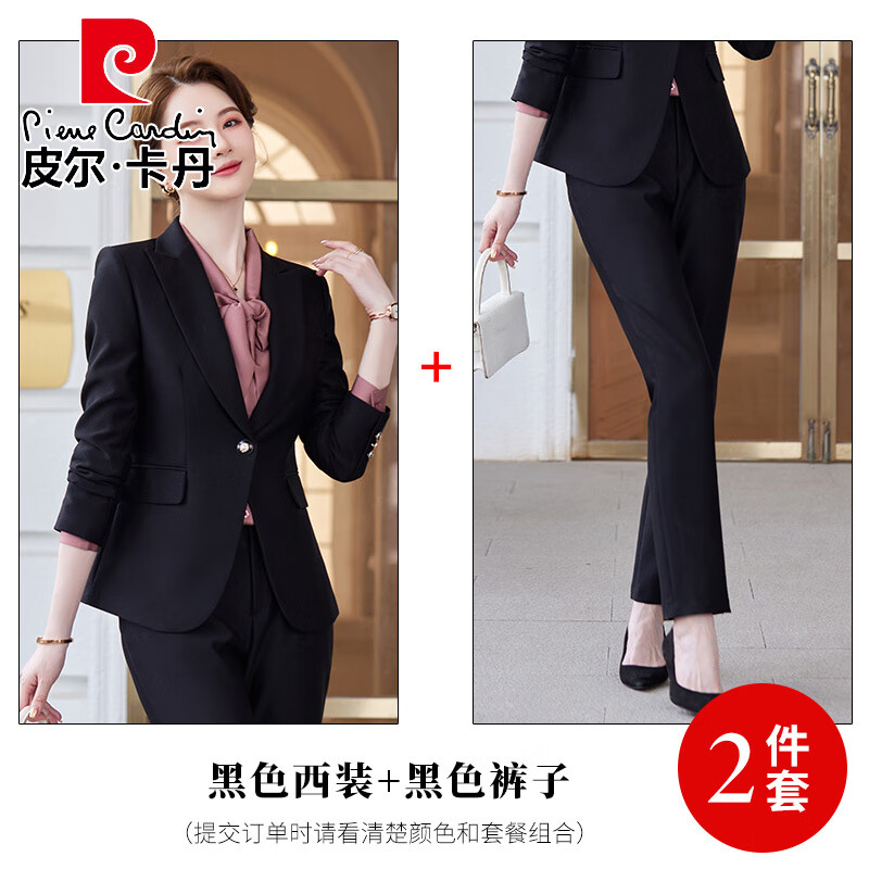 皮尔卡丹职业装西服套装女秋冬新款时尚正装高端气质小西装女神范工作服 黑色长袖外套+裤子 3XL【130斤~139斤】