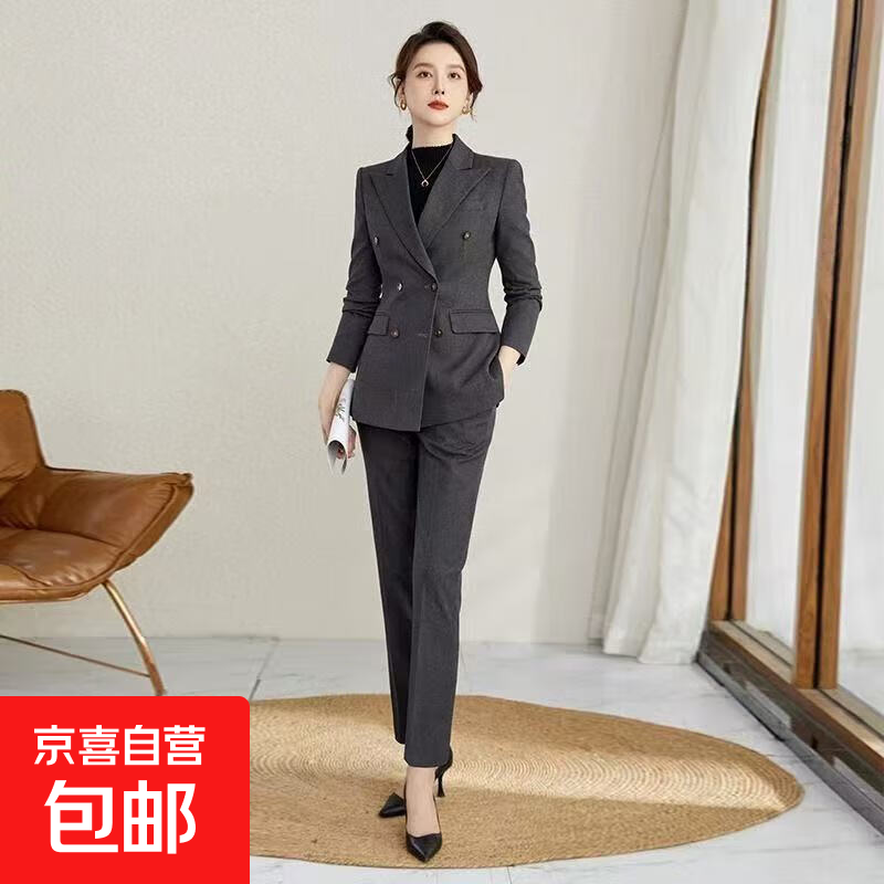 黛维亚高端西装套装女职业装正装秋冬新款时尚气质女神范工作服西 灰色西装+直筒裤 XL 【建议115-125斤】