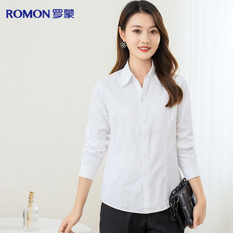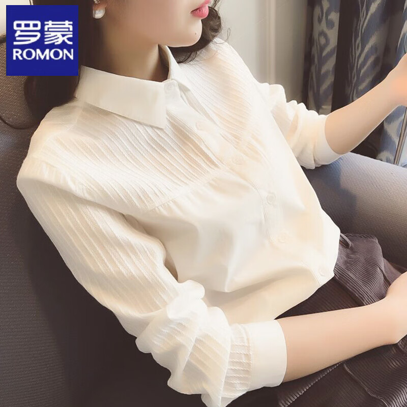 罗蒙(ROMON)春秋新款韩版文艺百搭白衬衫女长袖娃娃领纯棉修身职业装打底衬衣 白色尖 不加绒 M