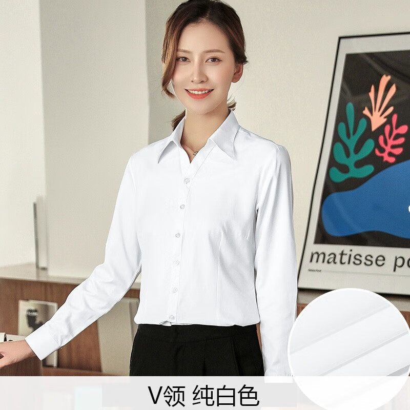 EAEOVNI长袖衬衫女商务免烫春夏职业装白色正装银行衬衣面试工作服修身OL 纯白色【V领】 38 【108-118斤】