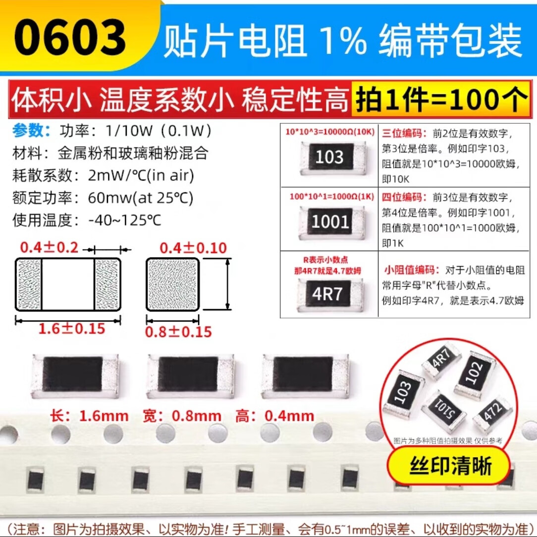 0603贴片电阻器元件1%1k2k4.7k10k47k100k0欧1欧10欧100欧120欧姆 0603 3K(100只)