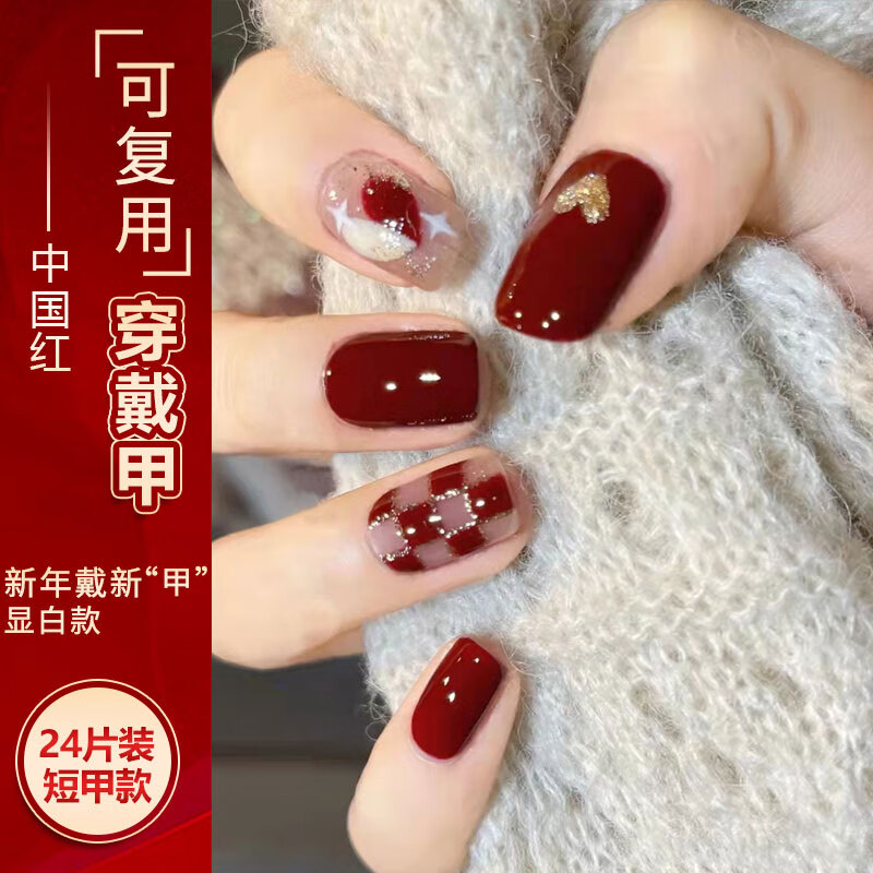 NHGAD穿戴甲短款中国红本命年手工美甲显白贴片假指甲可拆卸短款成品
