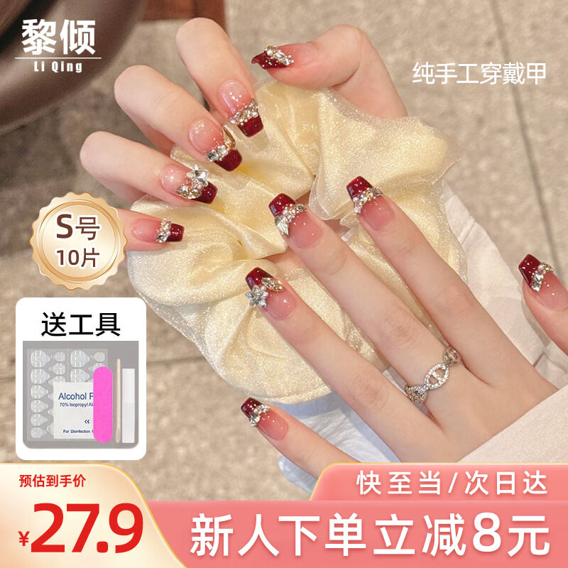 珂莱藻堂手工穿戴美甲贴片假指甲ins风情人节礼物指甲贴可拆卸全套收纳盒 短款 中国红 24片 盒