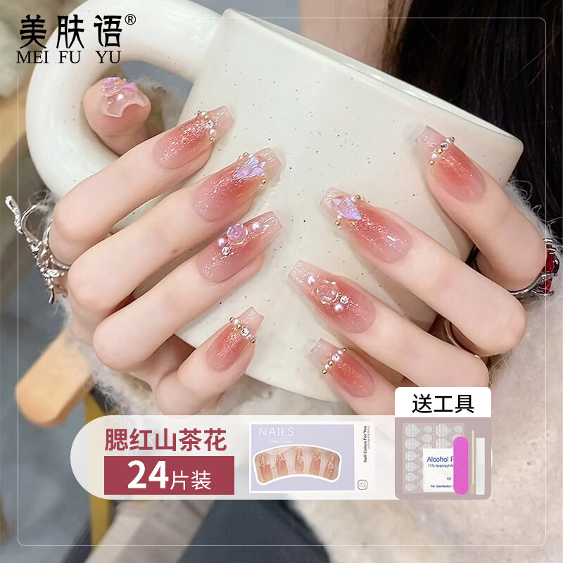 美肤语美甲贴片穿戴甲(腮红山茶花)长款假指甲果冻胶可拆带工具MF8248