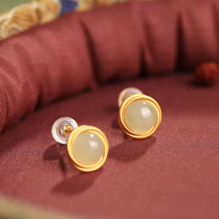 金镶玉耳钉小露珠天l然和田玉银女新中式国风耳饰耳环 【冰清玉润】