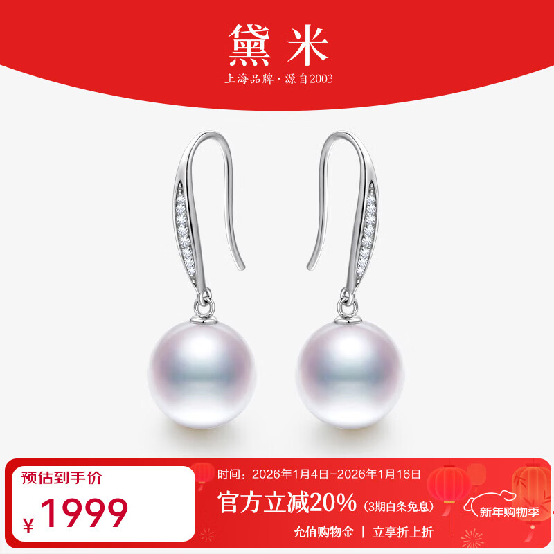黛米明月露珠 正圆淡水珍珠耳环耳钉18K金钻石耳钩女新年礼物女 10-11mm