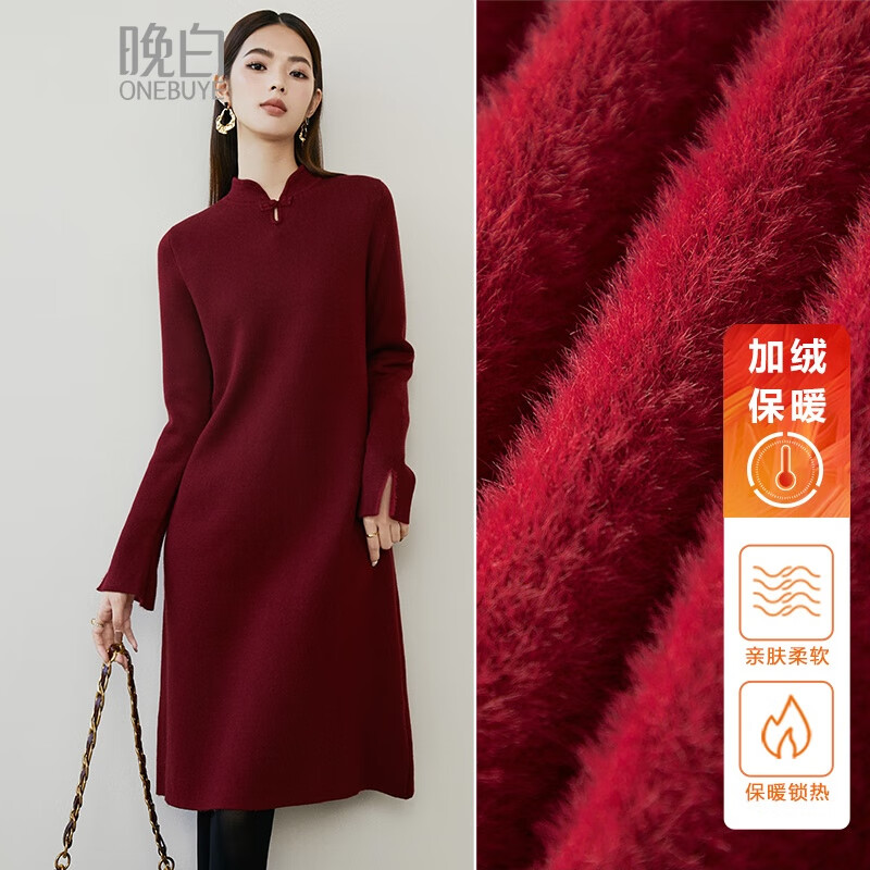 晚白【断码清仓】骐骥红新年穿搭新中式加绒保暖连衣裙显瘦宽松裙子 酒红色 S