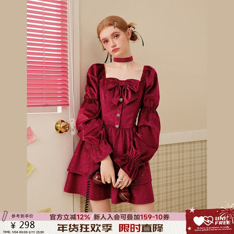 UNIFREE骐骥红圣诞新年穿搭千金风蝴蝶结装饰收腰长袖连衣裙 酒红色 M