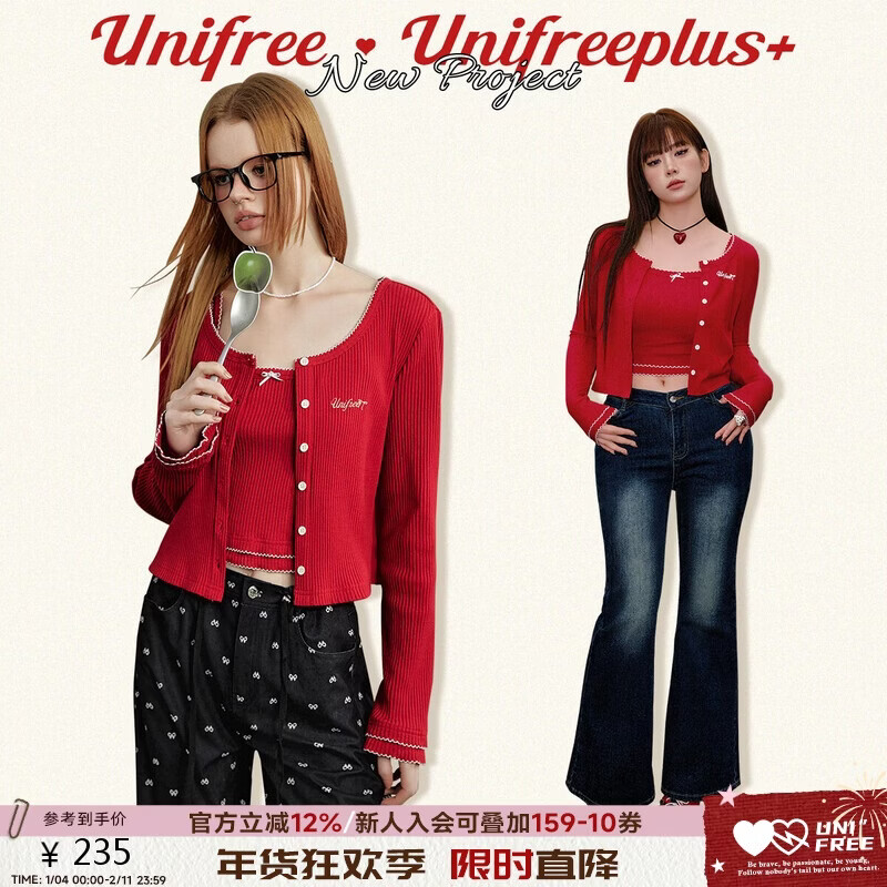 UNIFREE骐骥红圣诞新年穿搭纯欲辣妹刺绣吊带针织开衫套装 红色 M