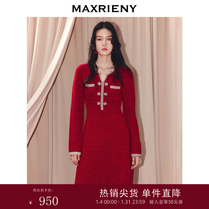 MAXRIENY骐骥红千金miu系穿搭撞色针织连衣裙25冬款小香风收腰X型长裙 红色 L