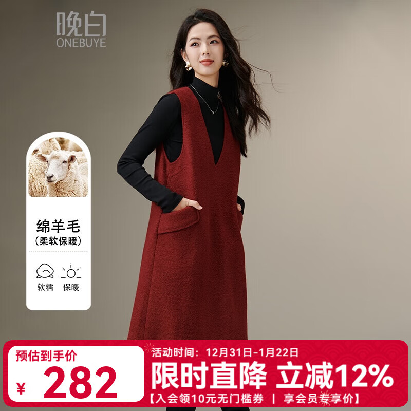 晚白【新品】2025冬款骐骥红新年穿搭V领含羊毛背心裙保暖无袖连衣裙 暗红色 M