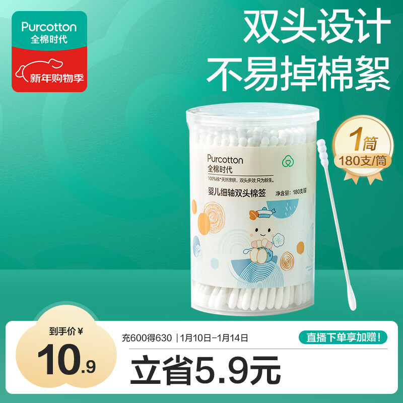 全棉时代(PurCotton)婴儿细轴双头棉签宝宝专用水滴头螺旋头双用180支/筒