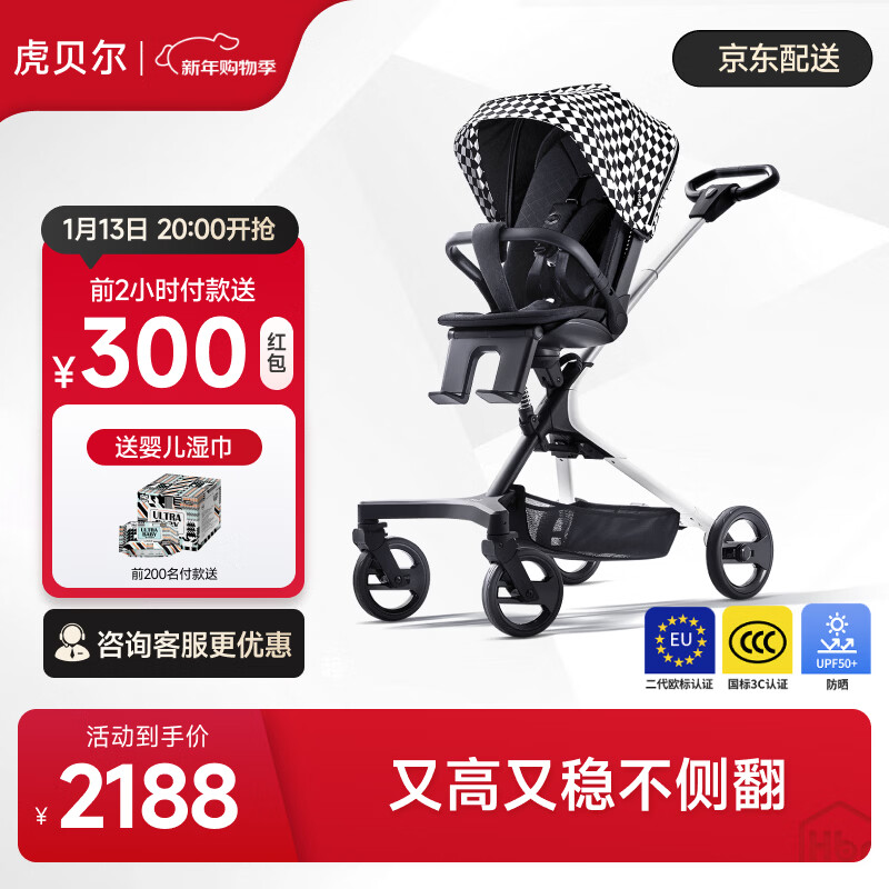 虎贝尔(HBR)遛娃神器轻便可折叠双向高景观可坐可躺婴儿推车城市漫步车黑白格