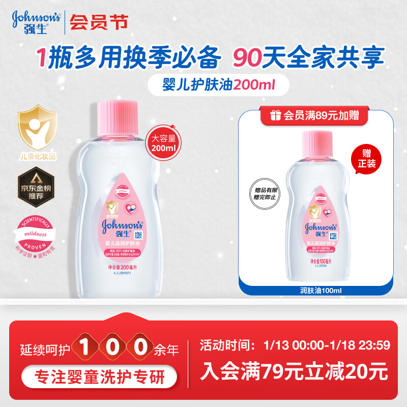 强生(Johnson)婴儿抚触油保湿护肤200m新生儿宝宝身体乳按摩精油护手防干全家用