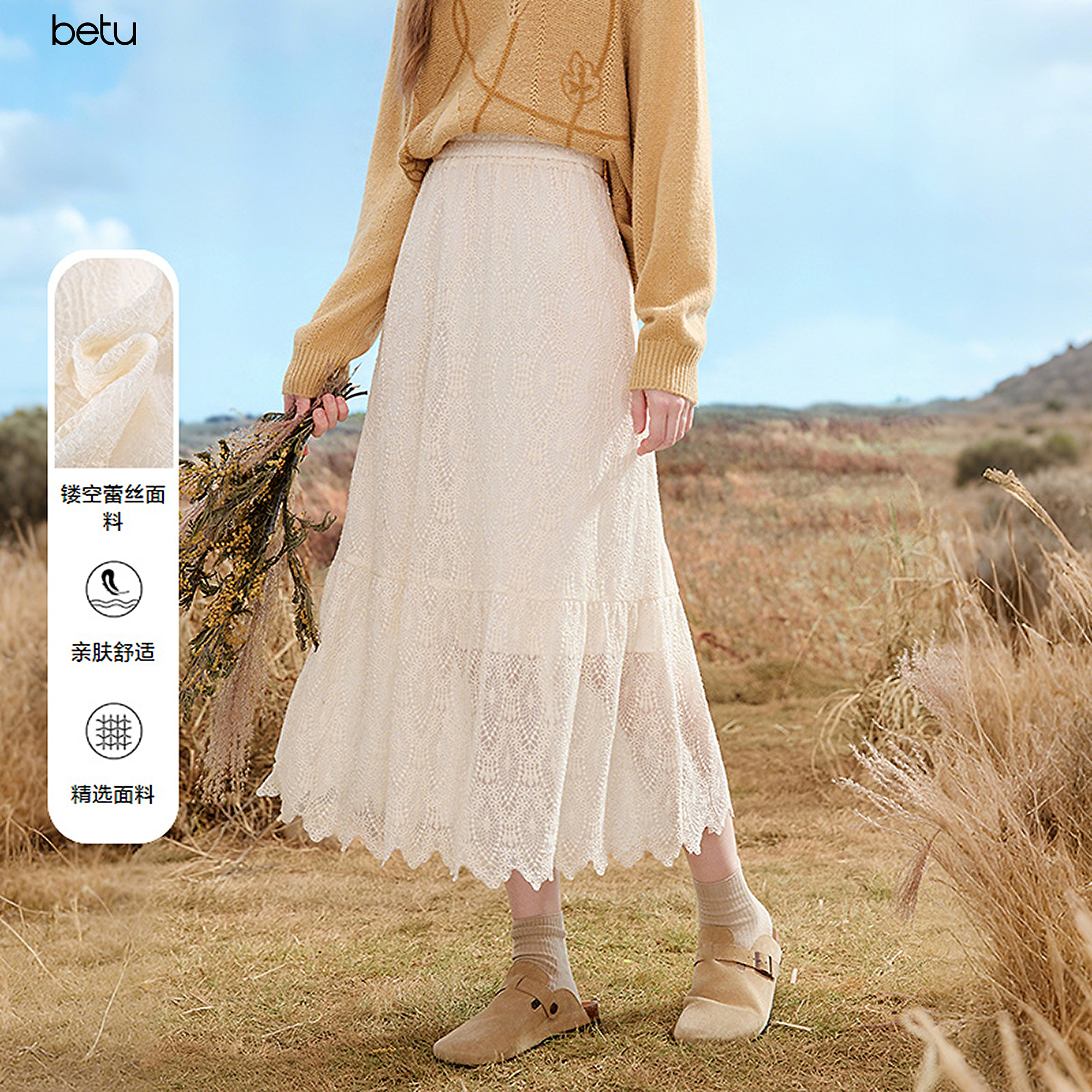 百图(betu)女装2025年秋季新款半身裙波嬉风镂空蕾丝高级感裙子女2509T79 杏色 L