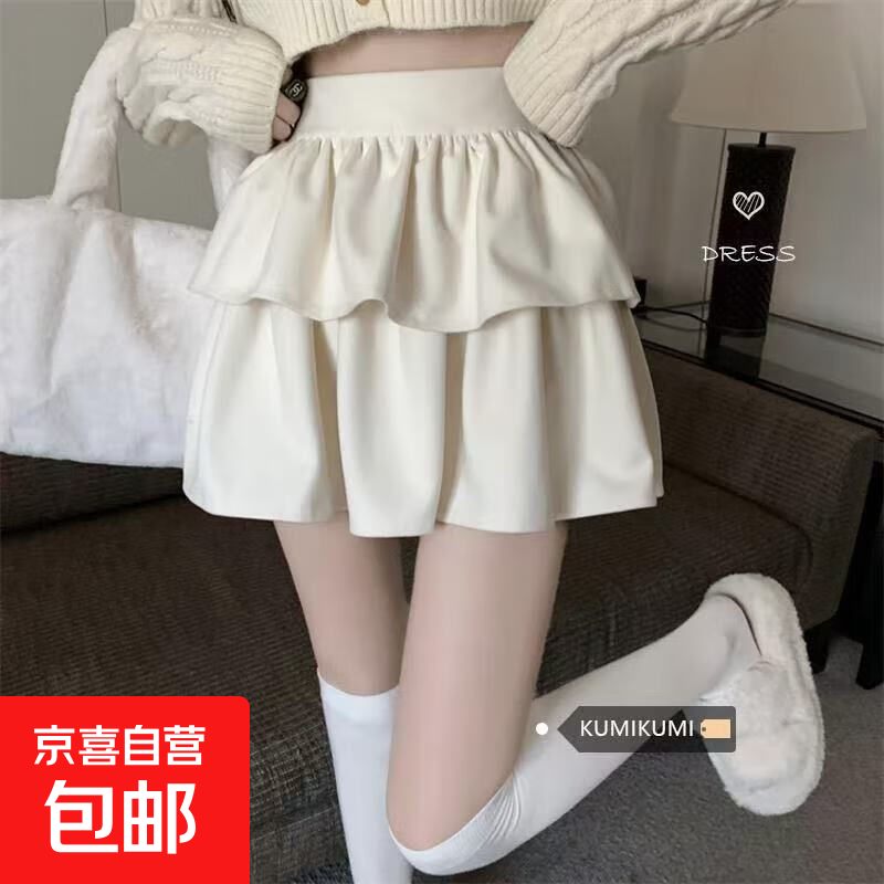 EGGKA法式荷叶边米杏色半身裙高腰a字内里加绒中裙E25B30288YM 米杏 L