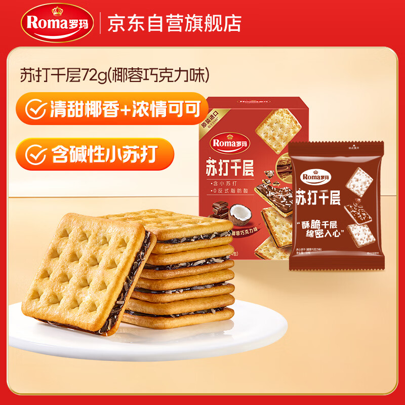 ROMA罗玛苏打千层夹心饼干椰蓉巧克力味76g 休闲零食早餐办公室下午茶