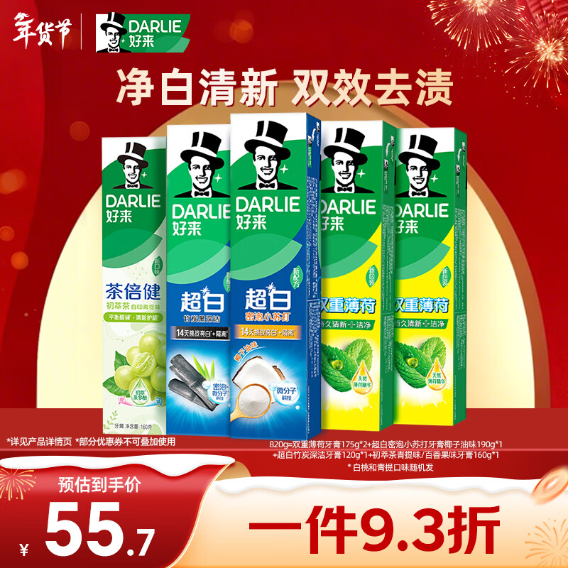 好来(原黑人) 清新美白牙膏套装抗口气净白去渍温和护牙龈5支820g