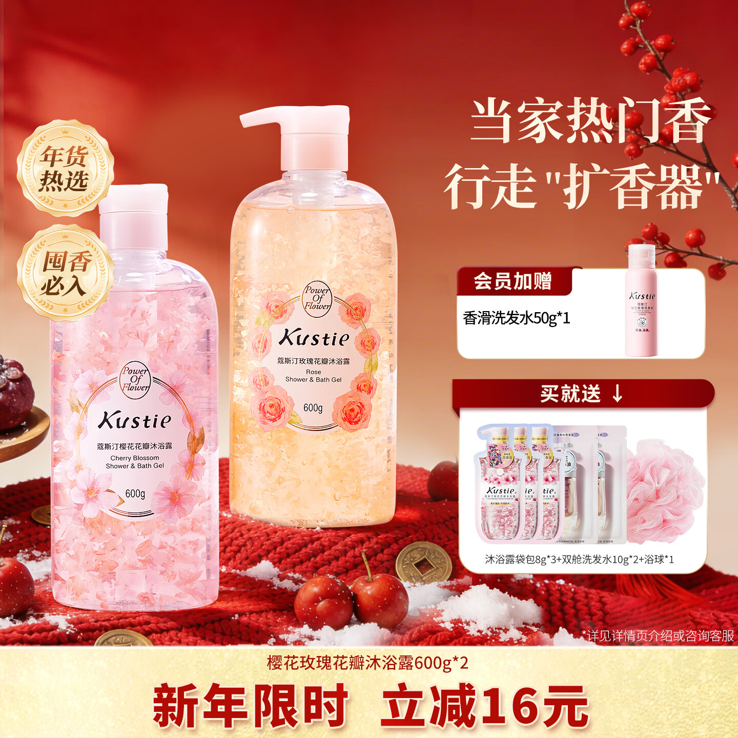 蔻斯汀(Kustie)香味持久滋润美肌保湿香氛沐浴液樱花玫瑰花瓣600g*2套装沐浴露