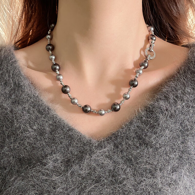恒久叶灰色珍珠项链女2025新款轻奢锁骨链长款感小众 灰色珍珠项链【短款】
