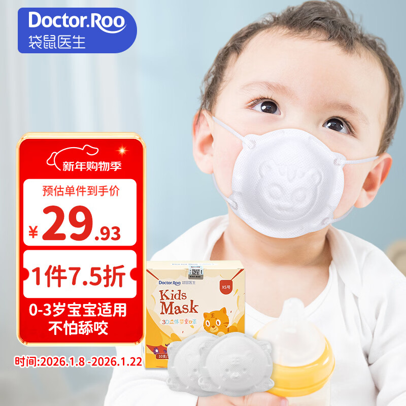 袋鼠医生儿童口罩3d立体0-6个月婴幼儿宝宝口罩6-12月白色10支防花粉柳絮