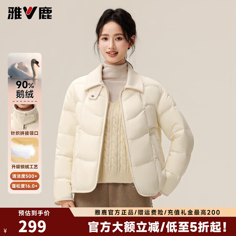 雅鹿【鹅绒】2025新款轻薄羽绒服女秋冬翻领时尚通勤显瘦休闲保暖外套 米黄 XL (170)