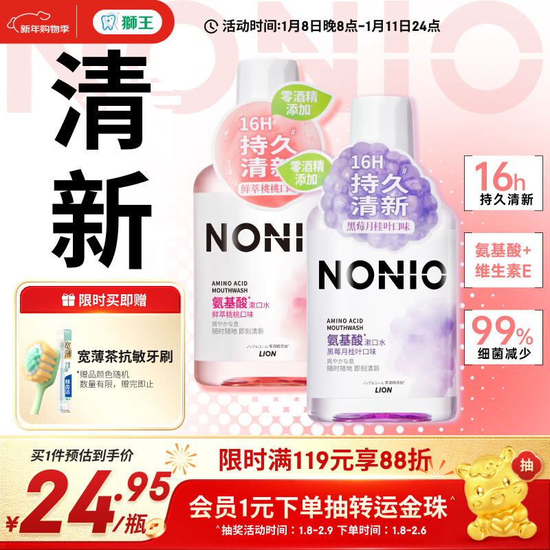 狮王(Lion)NONIO氨基酸漱口水桃桃黑莓450ml*2零酒精零蔗糖杀菌去口臭