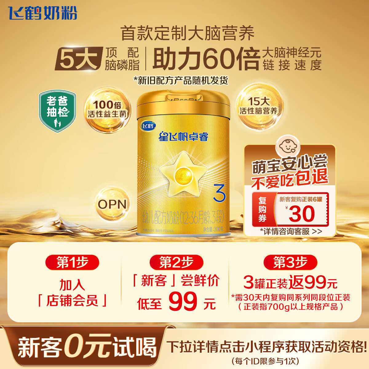 飞鹤星飞帆卓睿 婴幼儿配方奶粉3段(1-3岁)300克 育儿补贴 0元试用