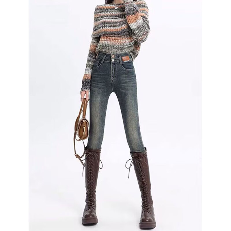 妃衣度(FYDOUL)牛仔裤女款秋冬款2025年新款加绒高腰修身显瘦弹力紧身小脚铅笔裤 蓝灰色长裤【单裤】 27 90-100斤