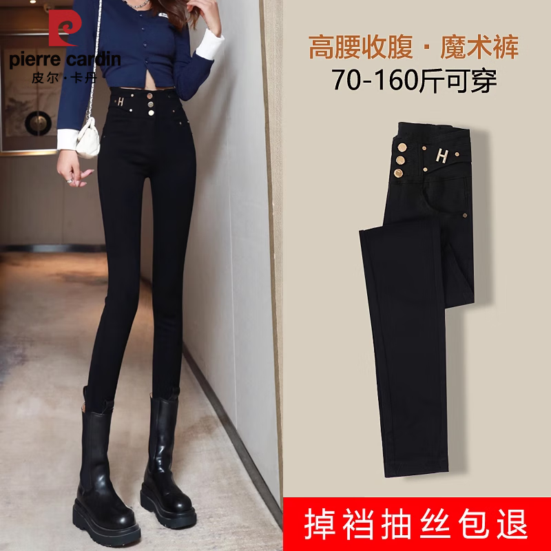 皮尔卡丹(pierre cardin)黑色打底裤女2025春秋新款排扣高腰铅笔裤显瘦弹力紧身小脚魔术裤 字母款【单裤】 S