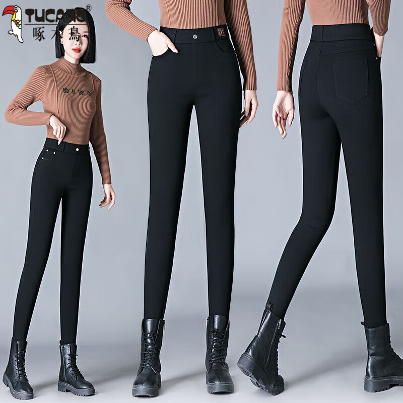 啄木鸟(TUCANO)加绒黑色牛仔裤女2025冬季新款高腰修身显瘦弹力紧身小脚铅笔裤女 黑色(单裤) 27 (建议80-95斤)