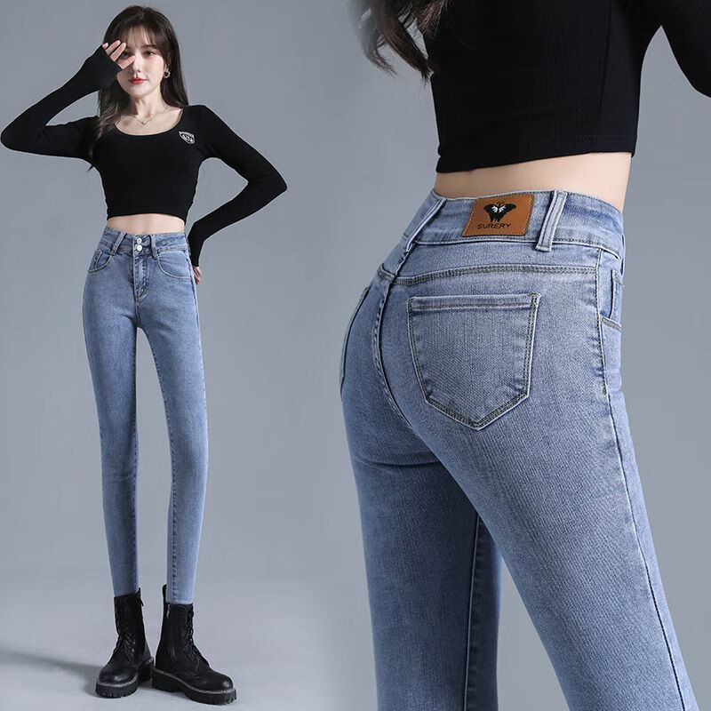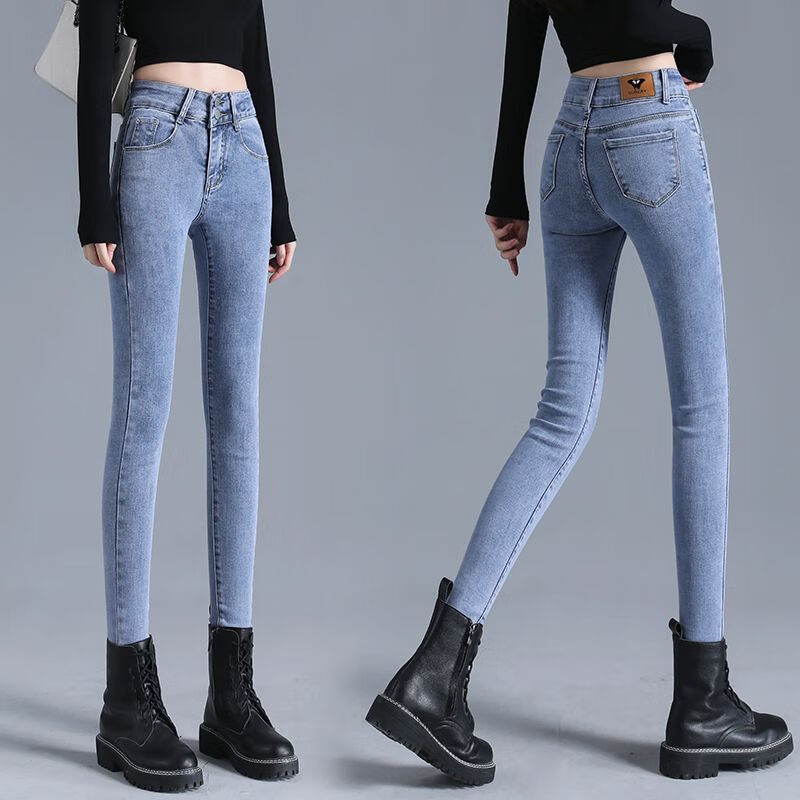 加绒/单裤 春秋新款高腰弹力修身显瘦牛仔裤女小脚裤长裤铅笔裤 1010-浅蓝色 27 建议 90-100斤