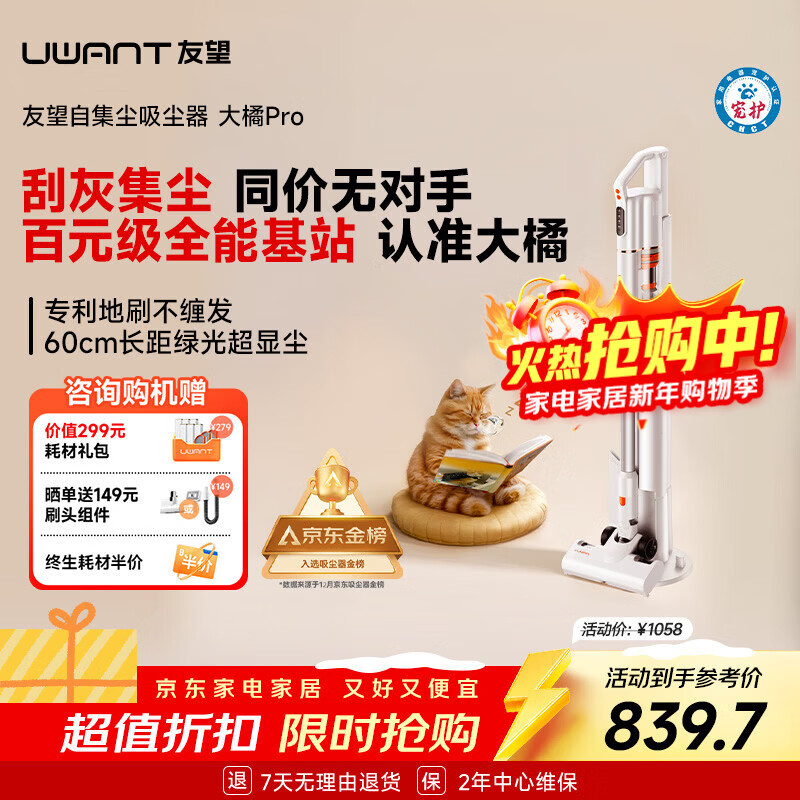 UWANT友望吸尘器大橘Pro自集尘【专利防缠 仿生刮环自清洁】小型车载家用大吸力无线吸尘器手持大功率