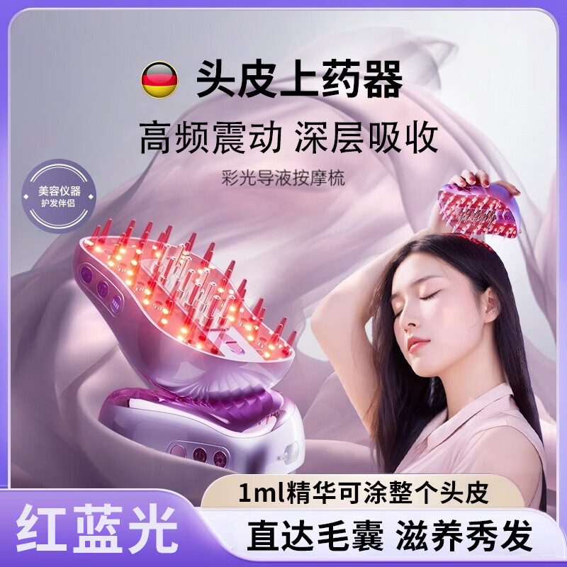 鸿志静选德国精油导入梳头皮上药器电动按摩梳子红光疗渗透米诺发液涂抹 紫色全配款【红蓝光疗+头皮上药】